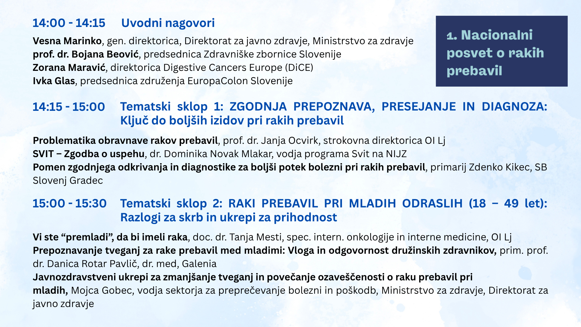 Prvi Nacionalni posvet o rakih prebavil se bo osredotočil na tri najpogostejše rake prebavil v Sloveniji: rak debelega črevesa in danke, rak želodca ter rak trebušne slinavke.