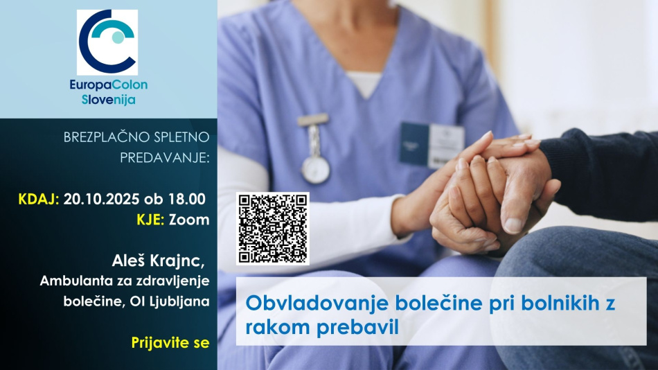 Vabimo vas na brezplačno spletno predavanje, ki bo v ponedeljek, 20. 10. 2025 ob 18.00 prek Zoom-a. Z nami bo Aleš Krajnc iz Ambulante za zdravljenje bolečine na Onkološkem Inštitutu v Ljubljani. Izvedeli boste več, kako bolečina vpliva na kakovost življenja, kaj so osnovni principi zdravljenja bolečine, o pomenu pravočasnega prepoznavanja bolečine, vlogi zdravstvenih delavcev pri obvladovanju bolečine, ter spoznali številne nasvete za bolnike in svojce, kako se soočati z bolečino doma. Pridružite se nam!