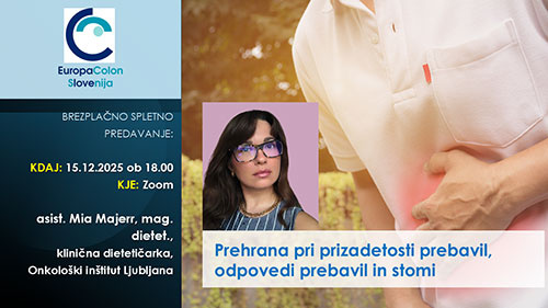 Vabljeni, da si ogledate posnetek spletnega predavanja Prehrana pri prizadetosti prebavil, odpovedi prebavil in stomi, ki je bilo 15. 12. 2025 prek Zoom-a. Z nami je bila asist. Mia Majerr, mag. dietet., klinična dietetičarka z Onkološkega inštituta Ljubljana.