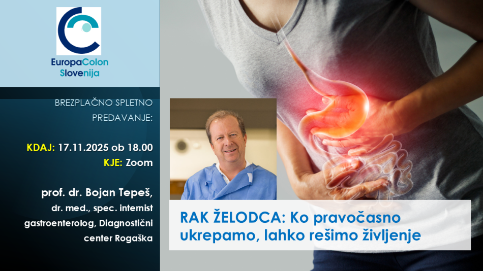 Vabimo vas na brezplačno spletno predavanje, ki bo v ponedeljek, 17. 11. 2025 ob 18.00 prek Zoom-a. Z nami bo prof. dr. Bojan Tepeš, dr. med., spec. internist gastroenterolog iz Diagnostičnega centra Rogaška. Izvedeli boste več o tem, kateri so najpogostejši dejavniki tveganja in zgodnji opozorilni znaki raka želodca, kako bakterija Helicobacter pylori vpliva na njegov razvoj, kako jo lahko odkrijemo in uspešno zdravimo ter o pomenu presejalnih programov in raziskav (projekta EUROHELICAN, TOGAS) za raka želodca v Sloveniji v bližnji prihodnosti in kaj bi to pomenilo. Pridružite se nam!